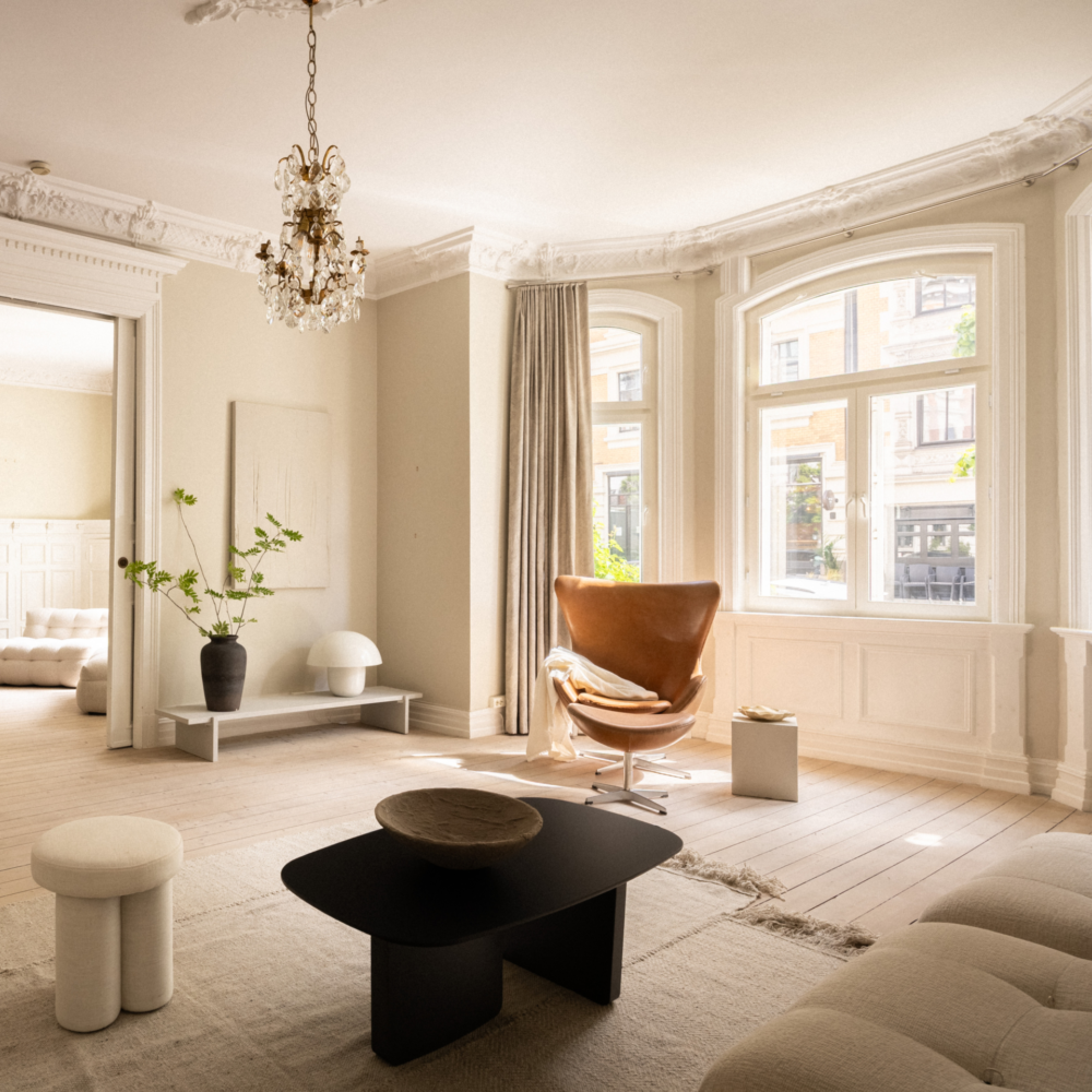 To stuer på rad med doble fløydører åpner seg mot lyset fra de store vinduene, og kakkelovnen i stuen gir hjemmet et behagelig preg som både varmer og begeistrer.